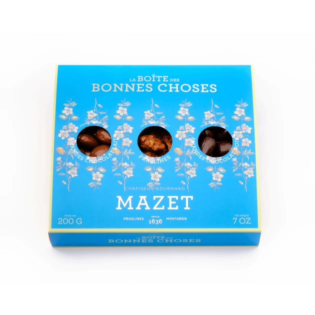 Ce coffret cadeau aussi appelé boîte bonnes choses par la maison Mazet abrite 3 recettes différentes de sucreries à déguster sans modération. Vous trouverez ainsi à l’intérieur de cette boîte de friandises des amandes au chocolat noir et au lait, ainsi que des pralines Mazet pour la touche confiserie réconfortante.